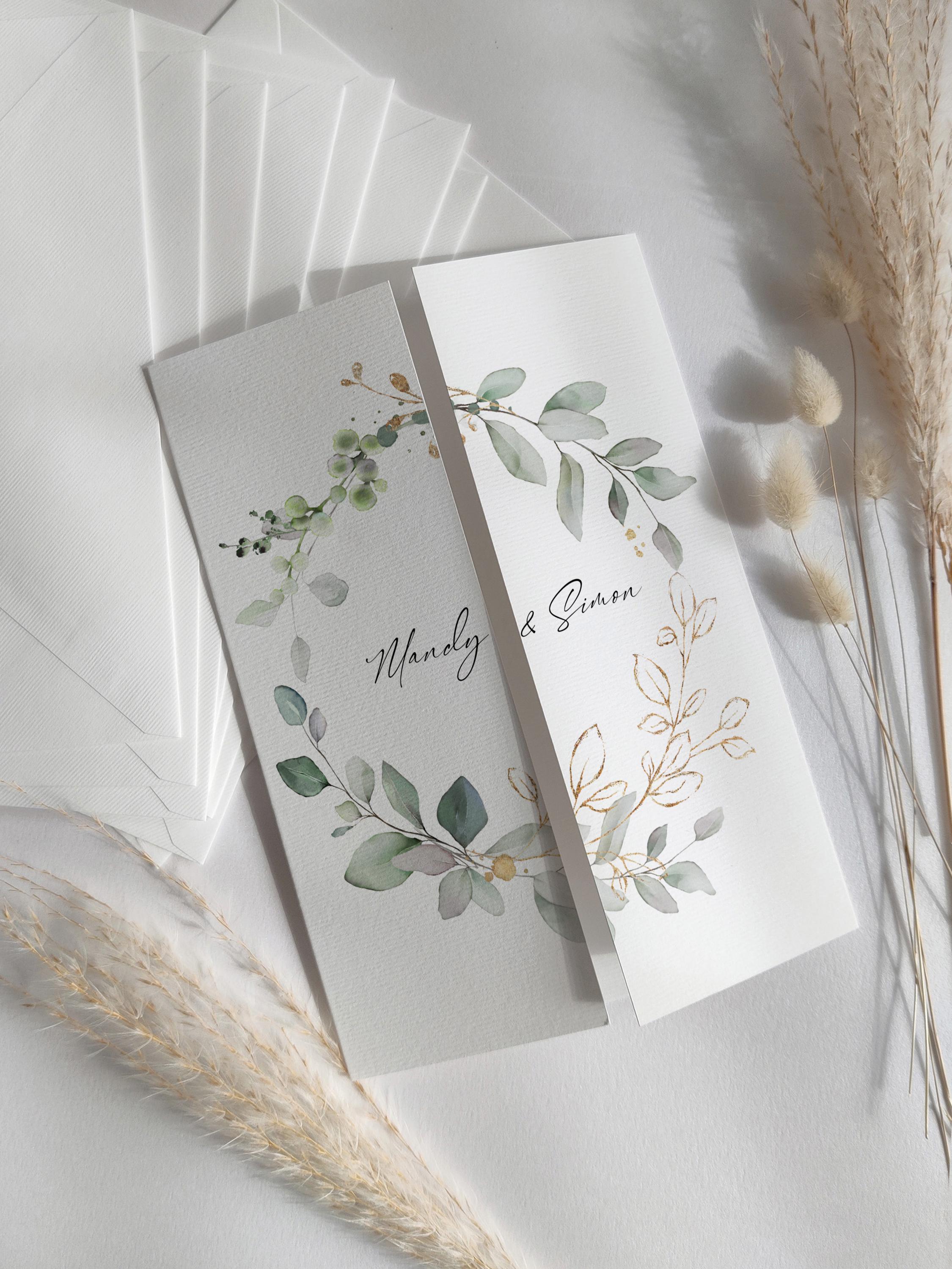 Create your own beautiful greenery gatefold wedding invitations with these Canva templates