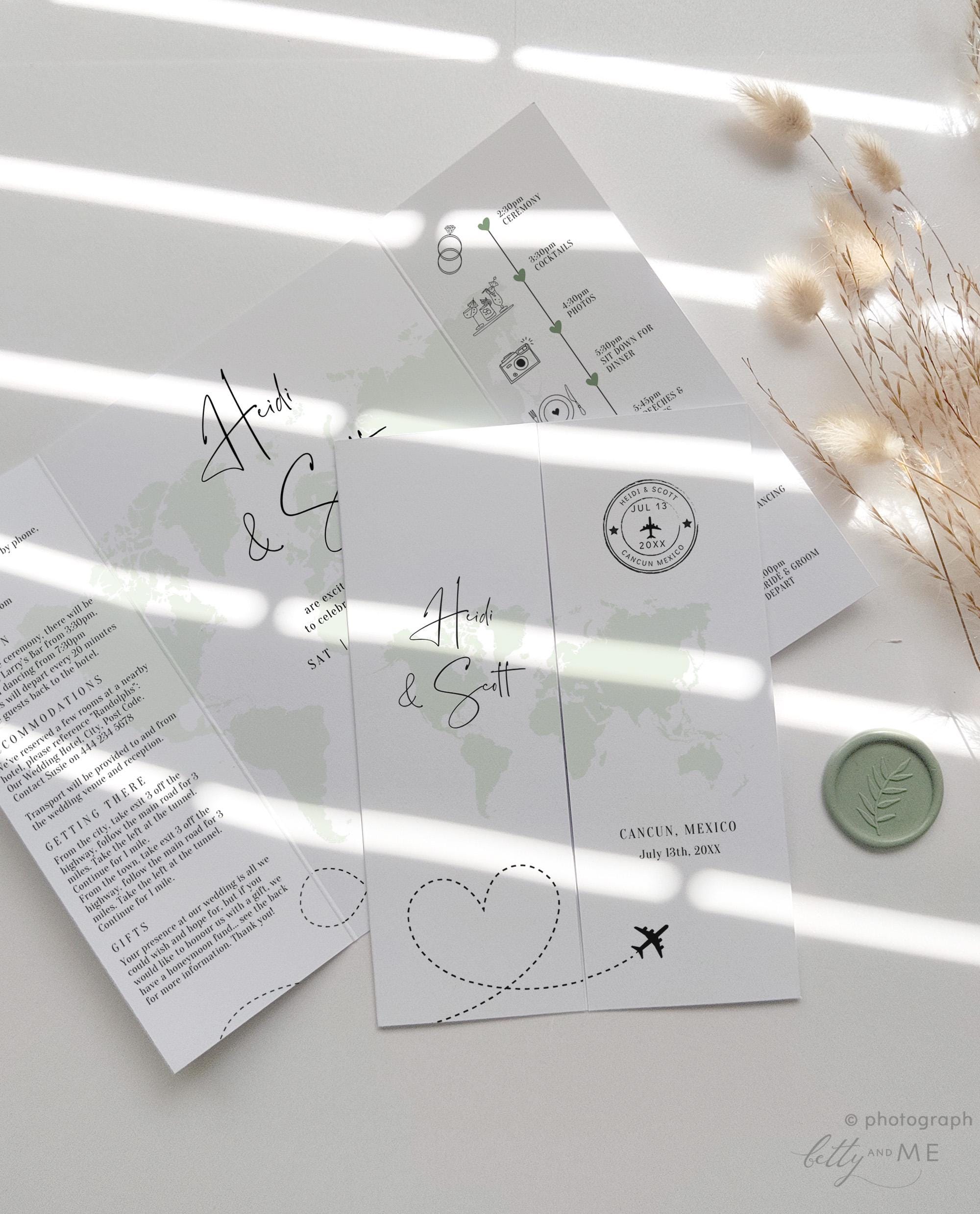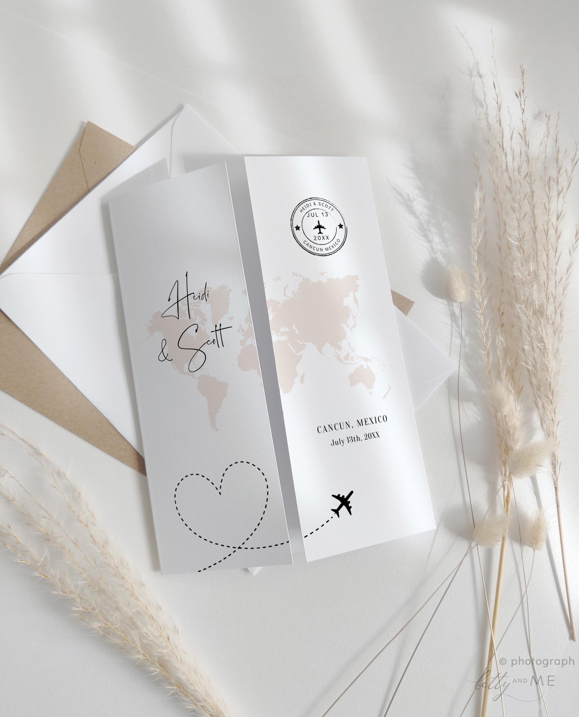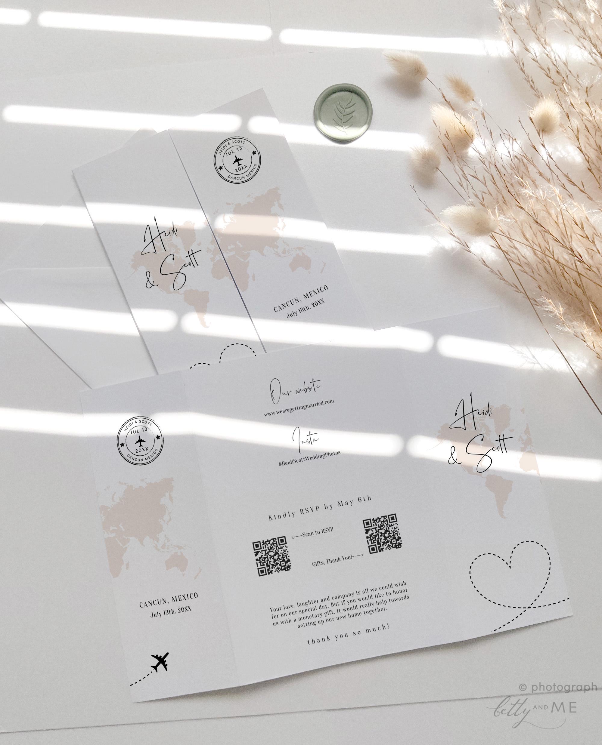 Create your own gatefold wedding destination invitations with these Canva templates.