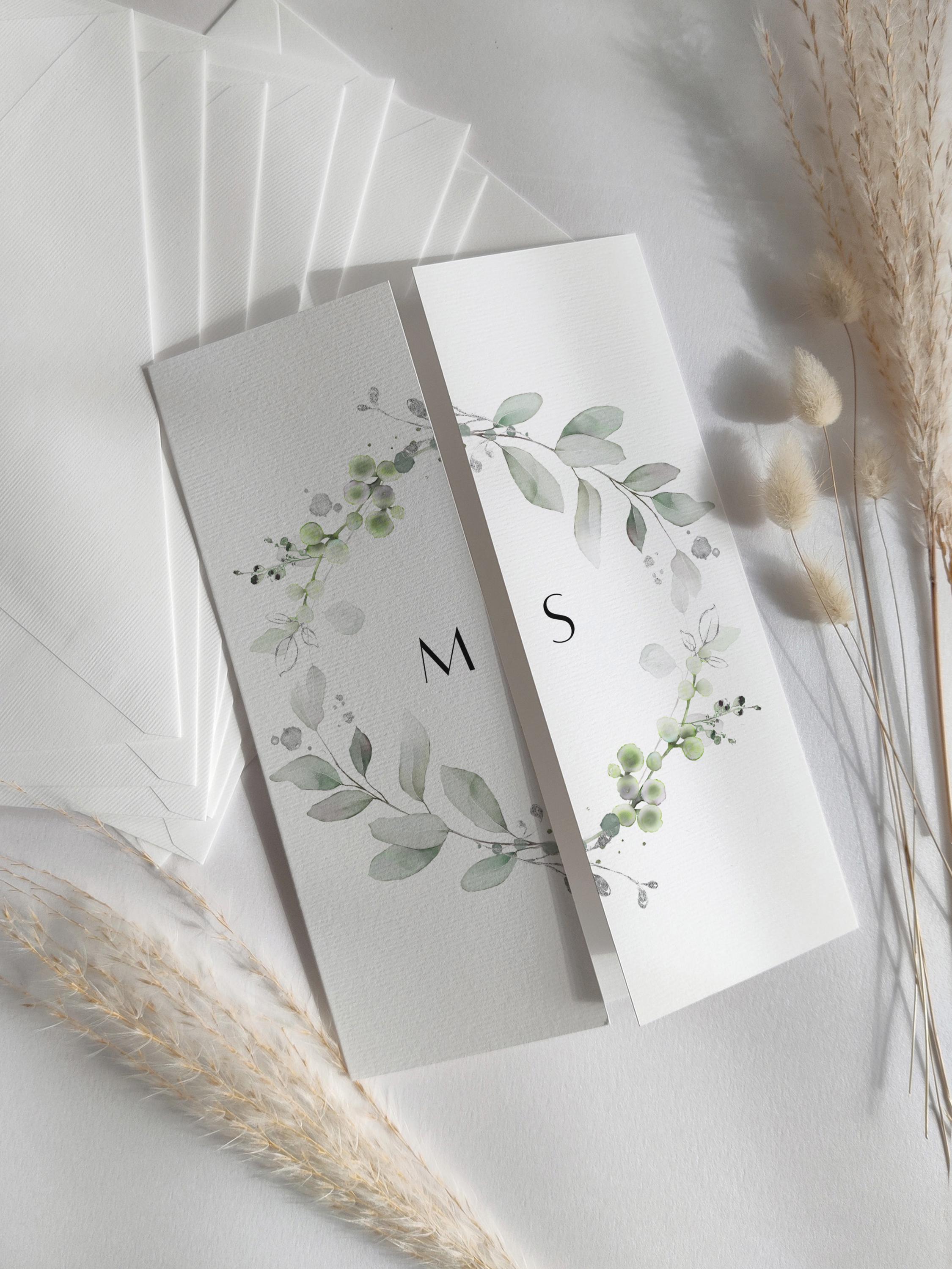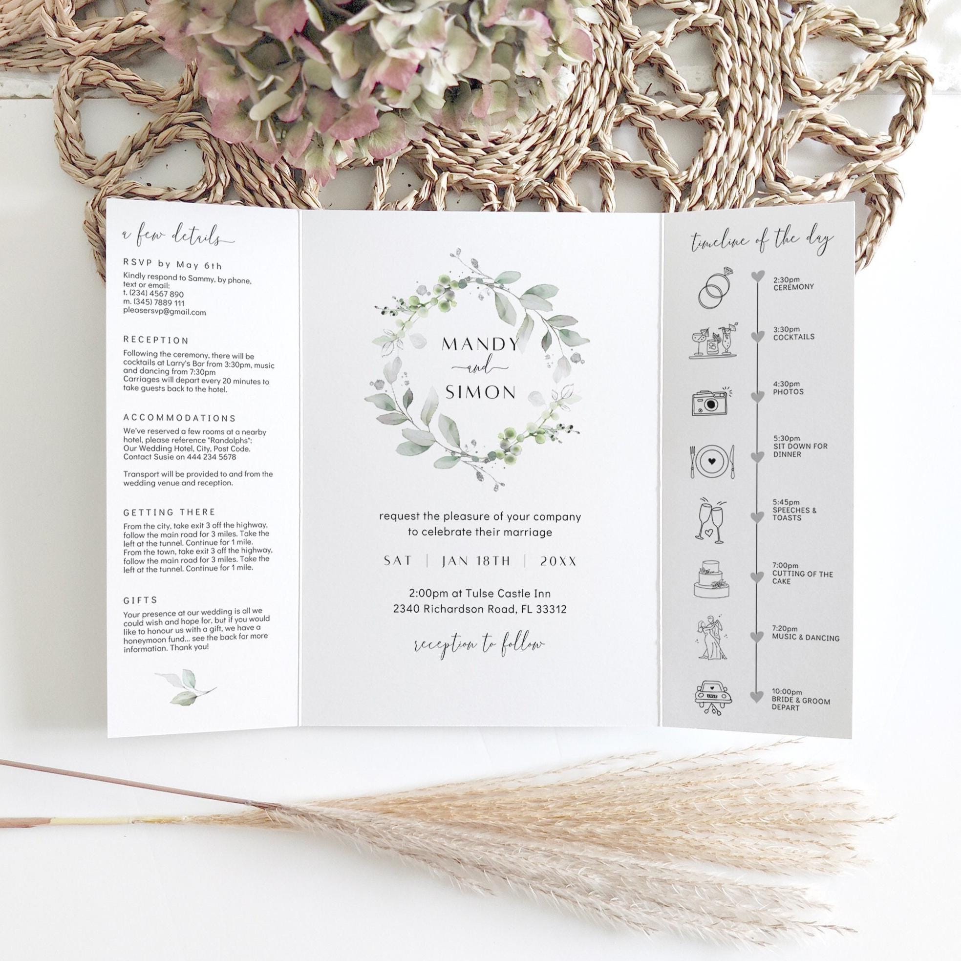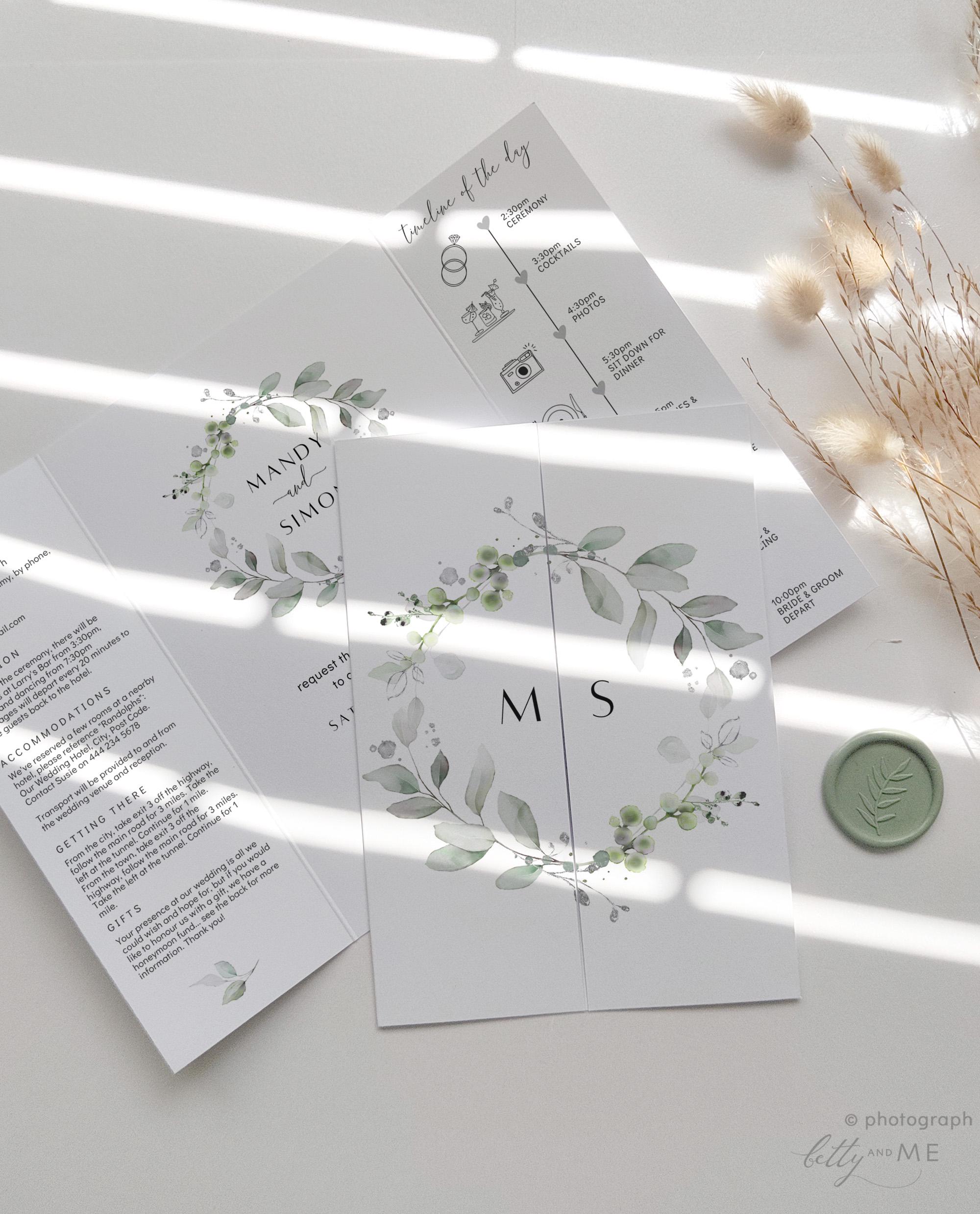 With a green and silver foliage design, easily create your own beautiful gatefold wedding invitations with these templates.