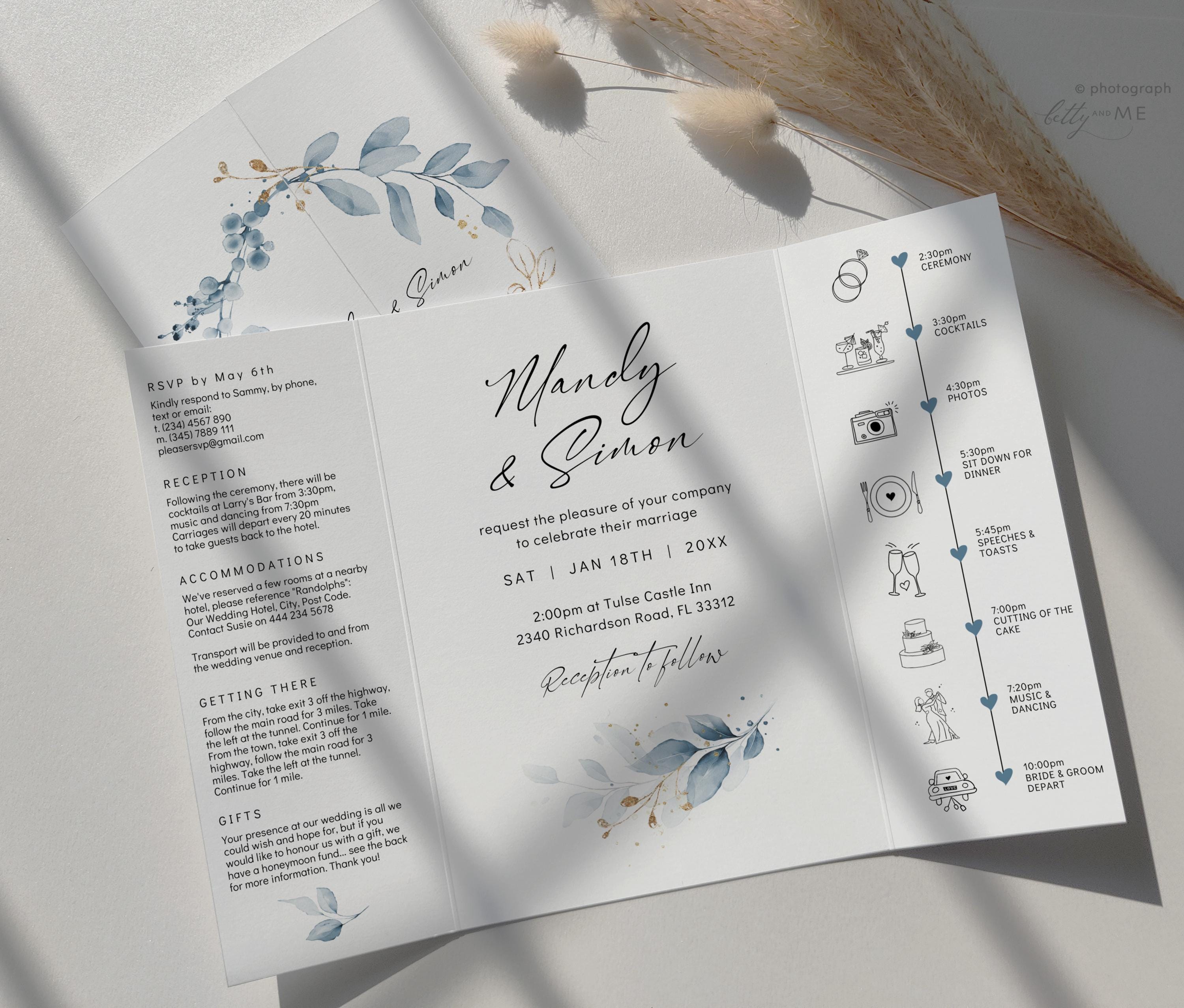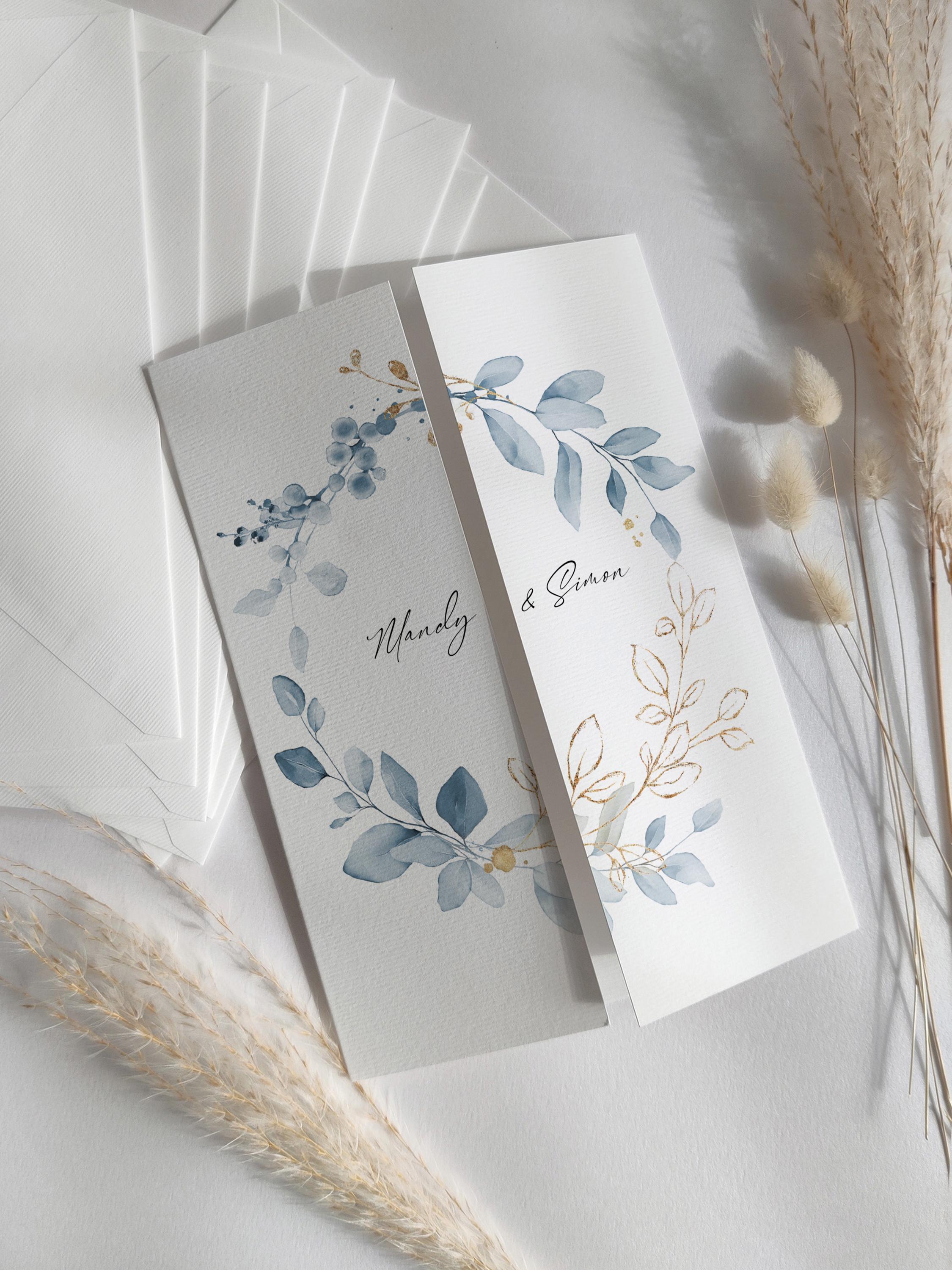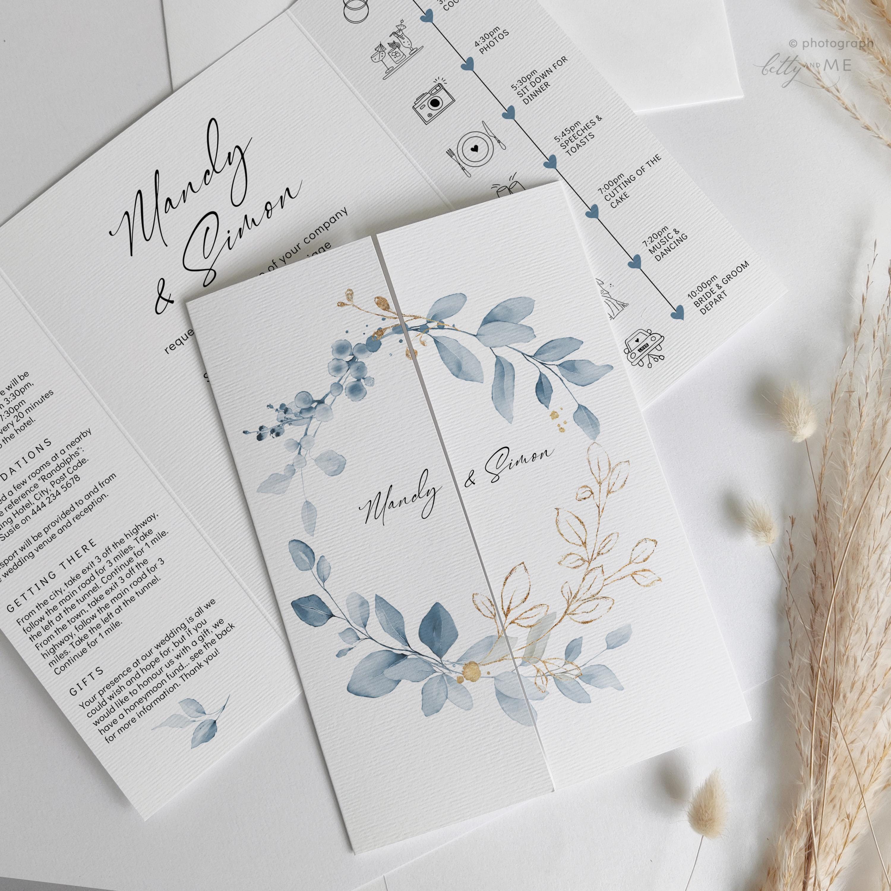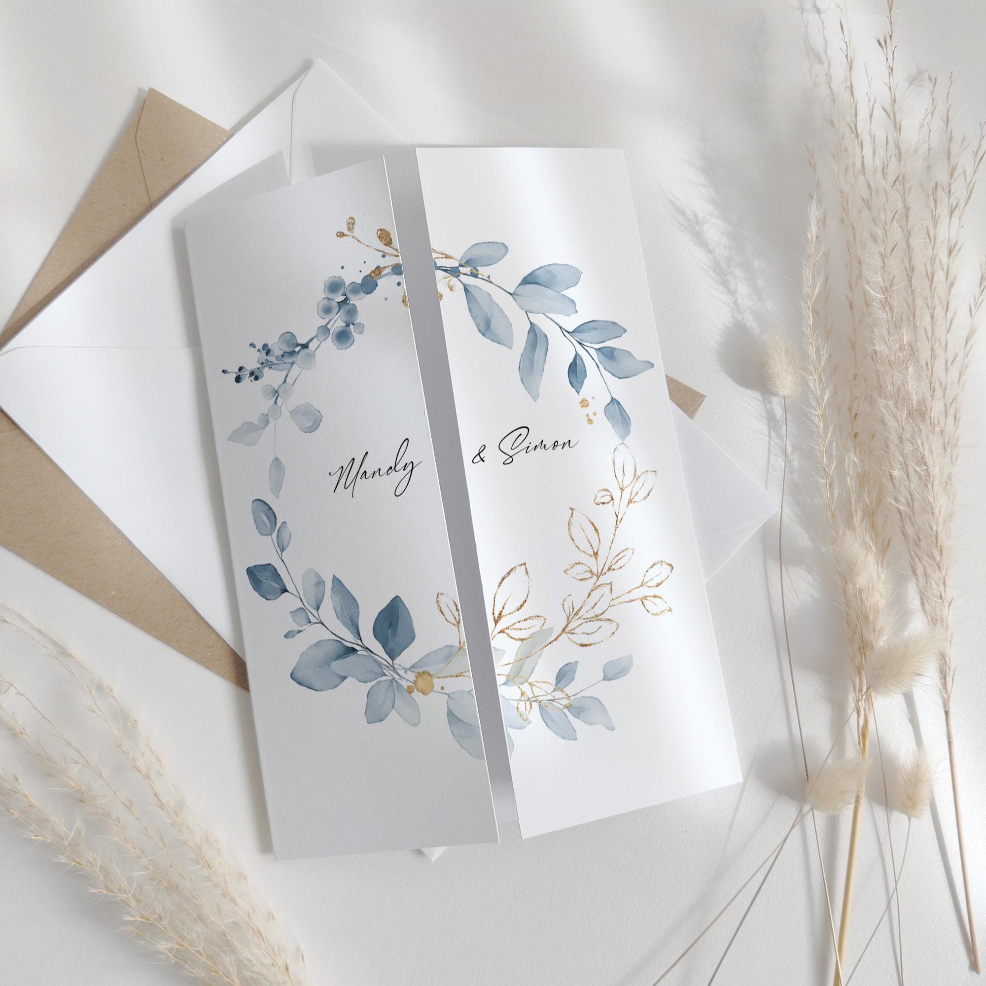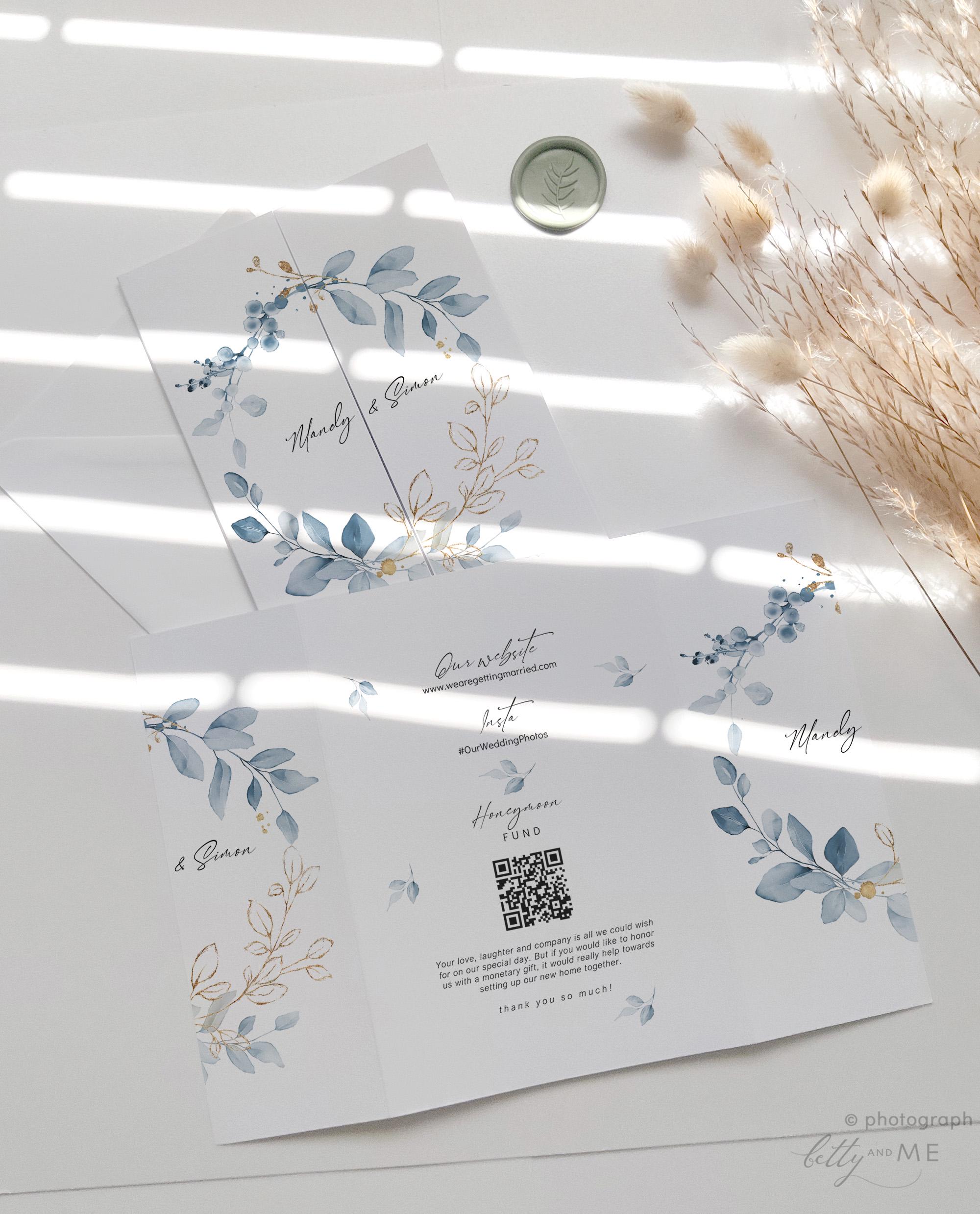 Create your own beautiful dusty blue leaf gatefold wedding invitations with these templates.