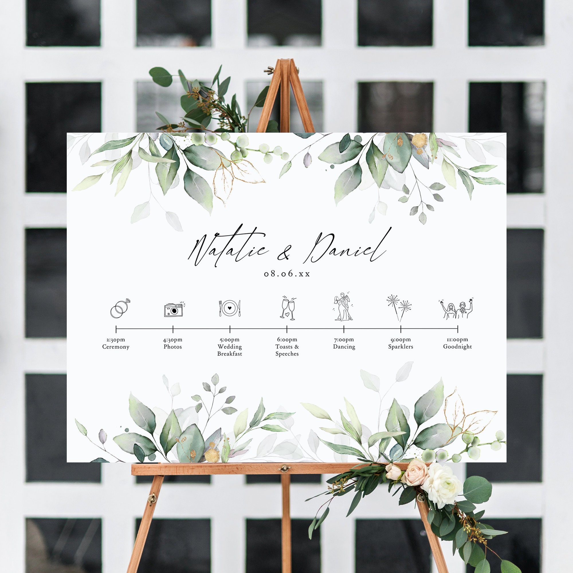 8 Sizes, Wedding Timeline Signs with greenery and eucalyptus. Edit, download, print.