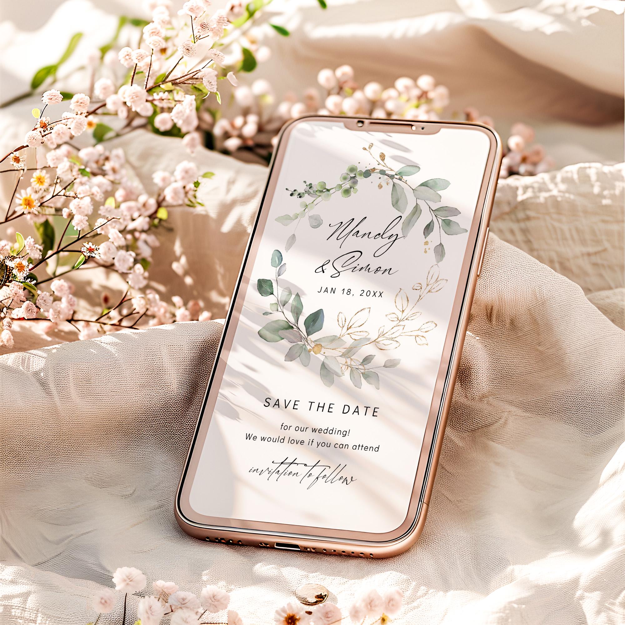 Greenery Wedding Smartphone Invitation set. Choose from Save the Date, Invitation, Details and Timeline templates. Edit and download to Email or Text. Download as PNG or JPG.