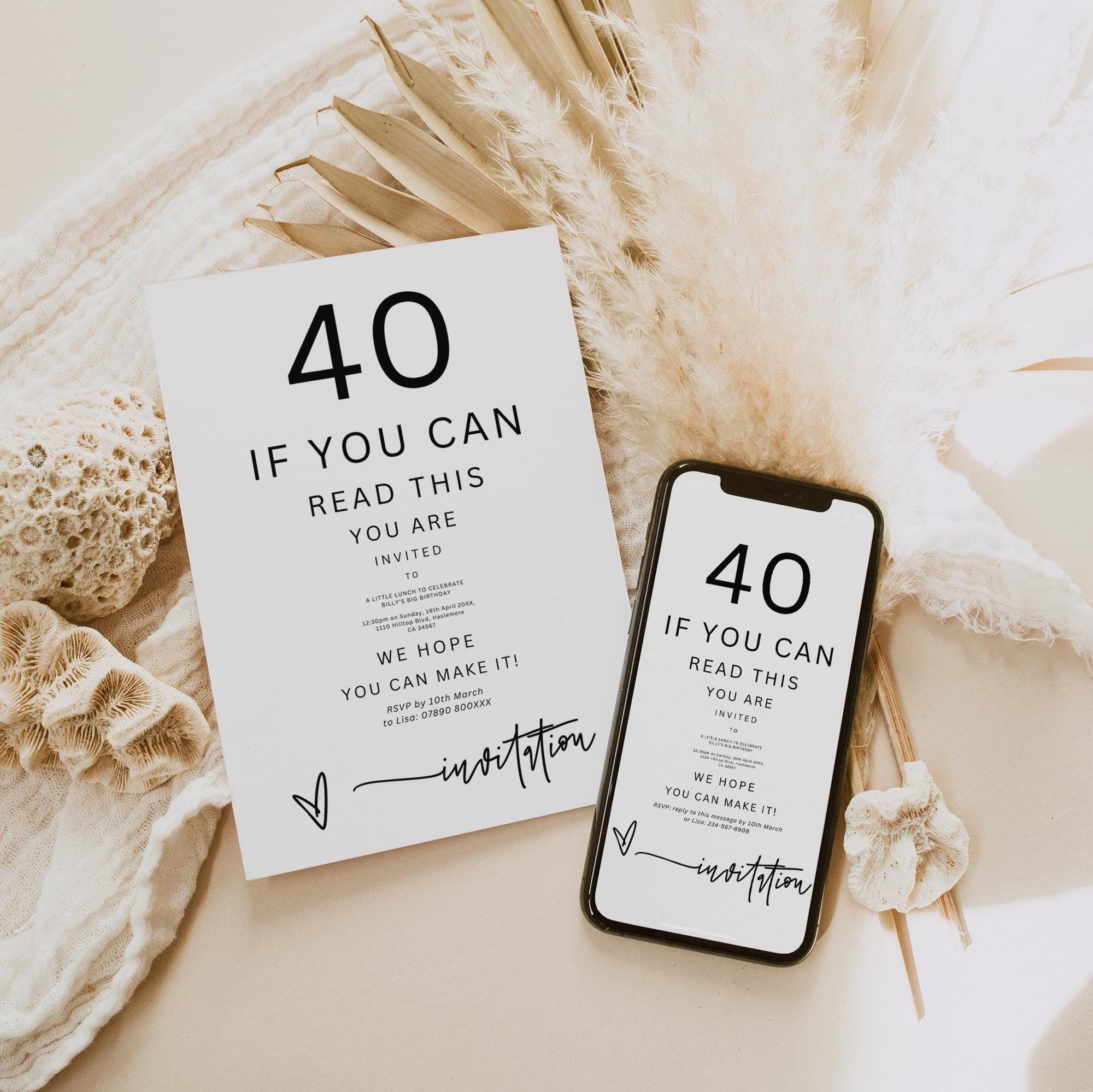 40th Birthday Invitations. Edit and download these Electronic and Printable Invitations, Email or Text Message as PNG or JPG. Also includes 5 printable template sizes for invitation cards: 4x6", 5x7", 4x9", A6 (10.5x14.8cm) and DL (9.9x21cm)