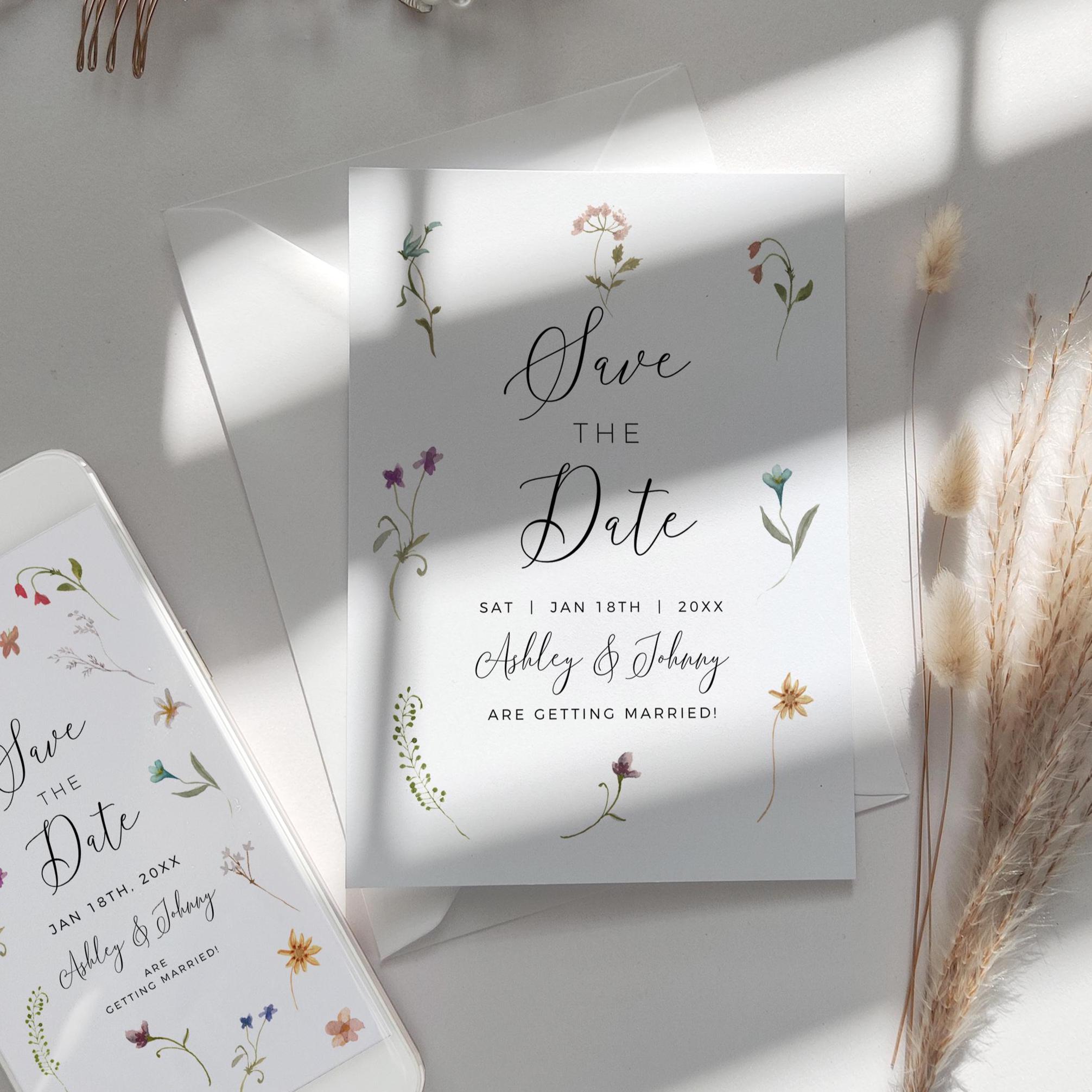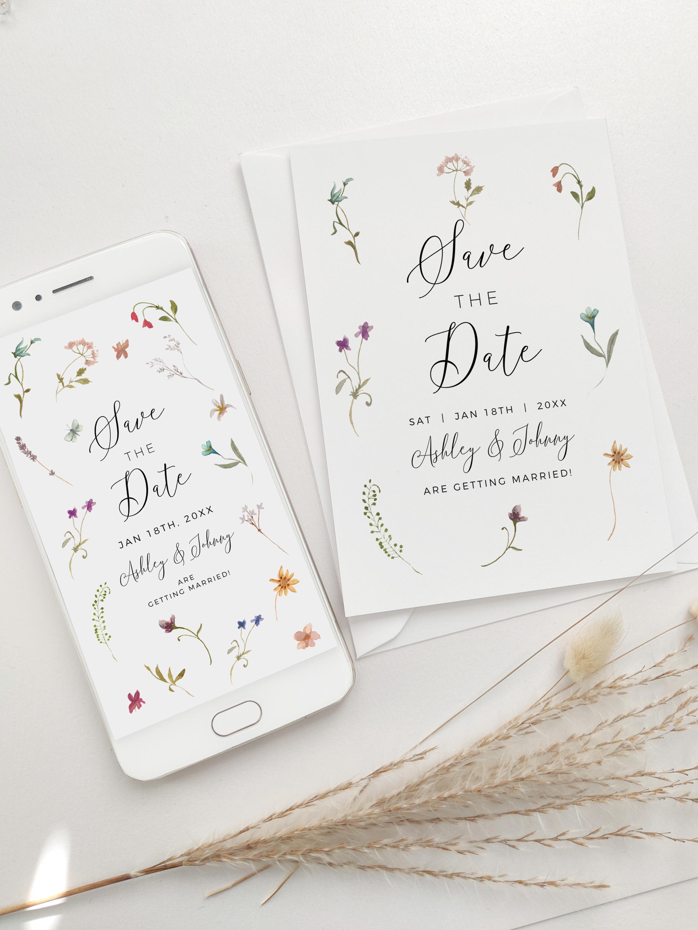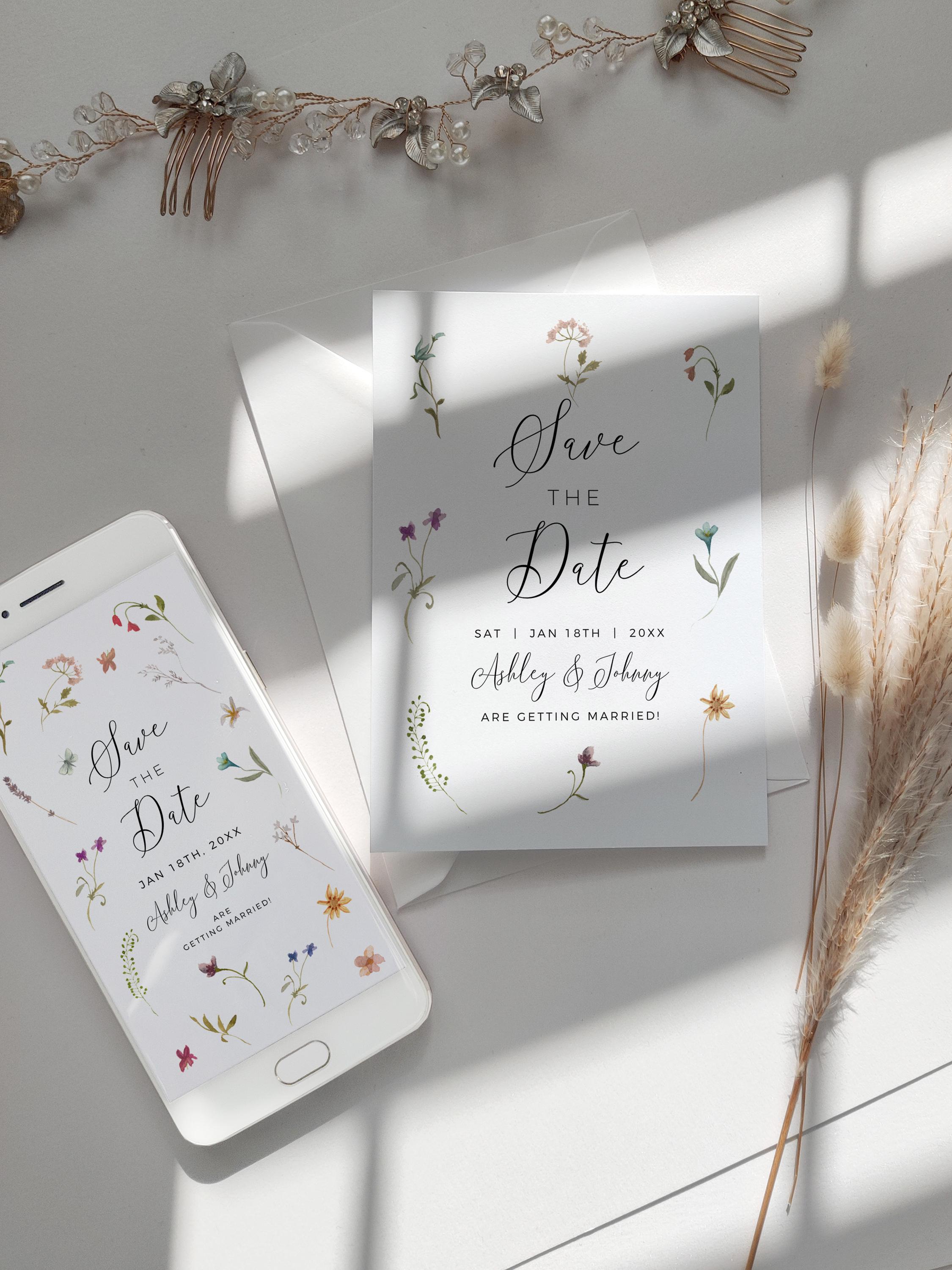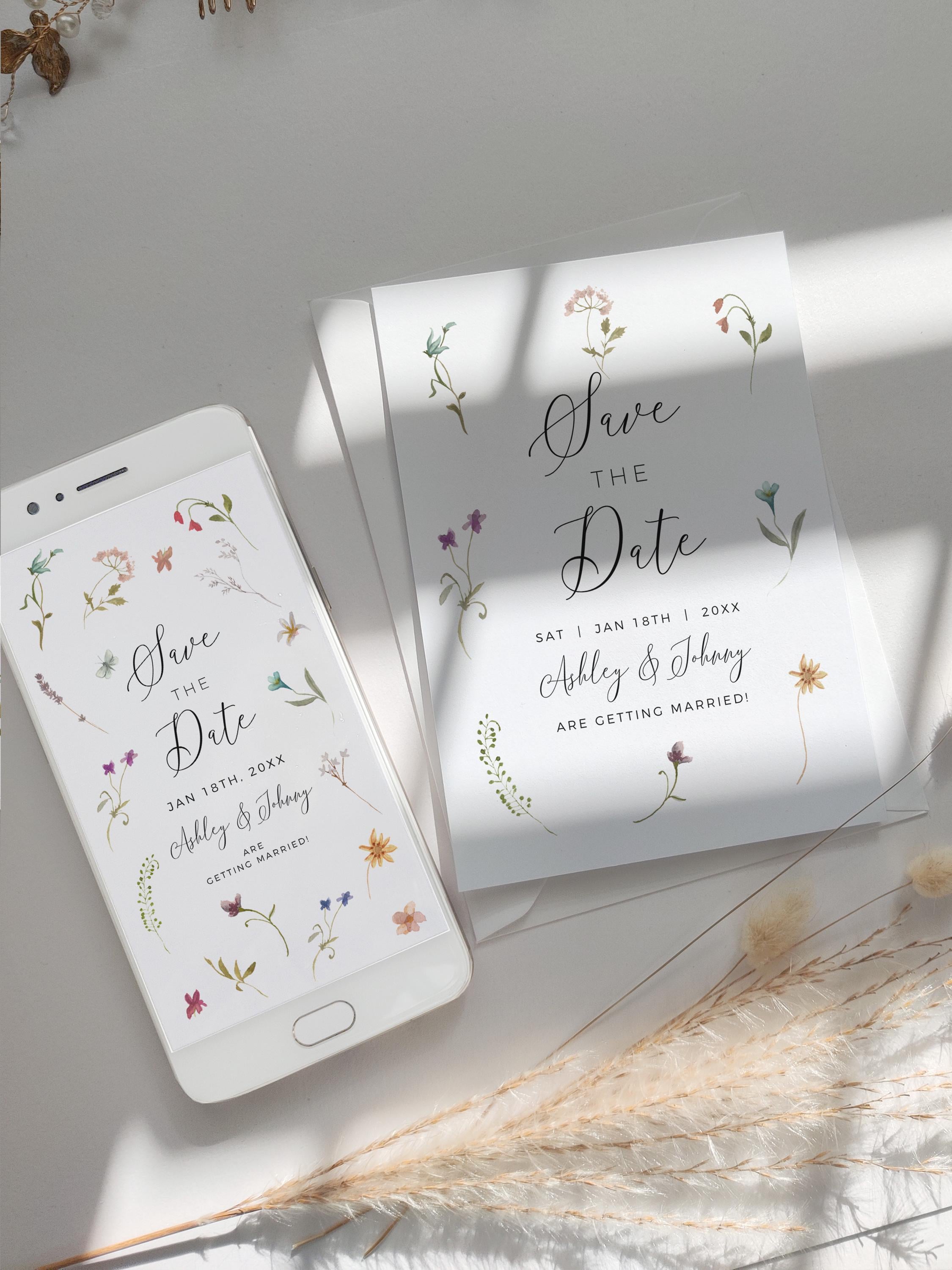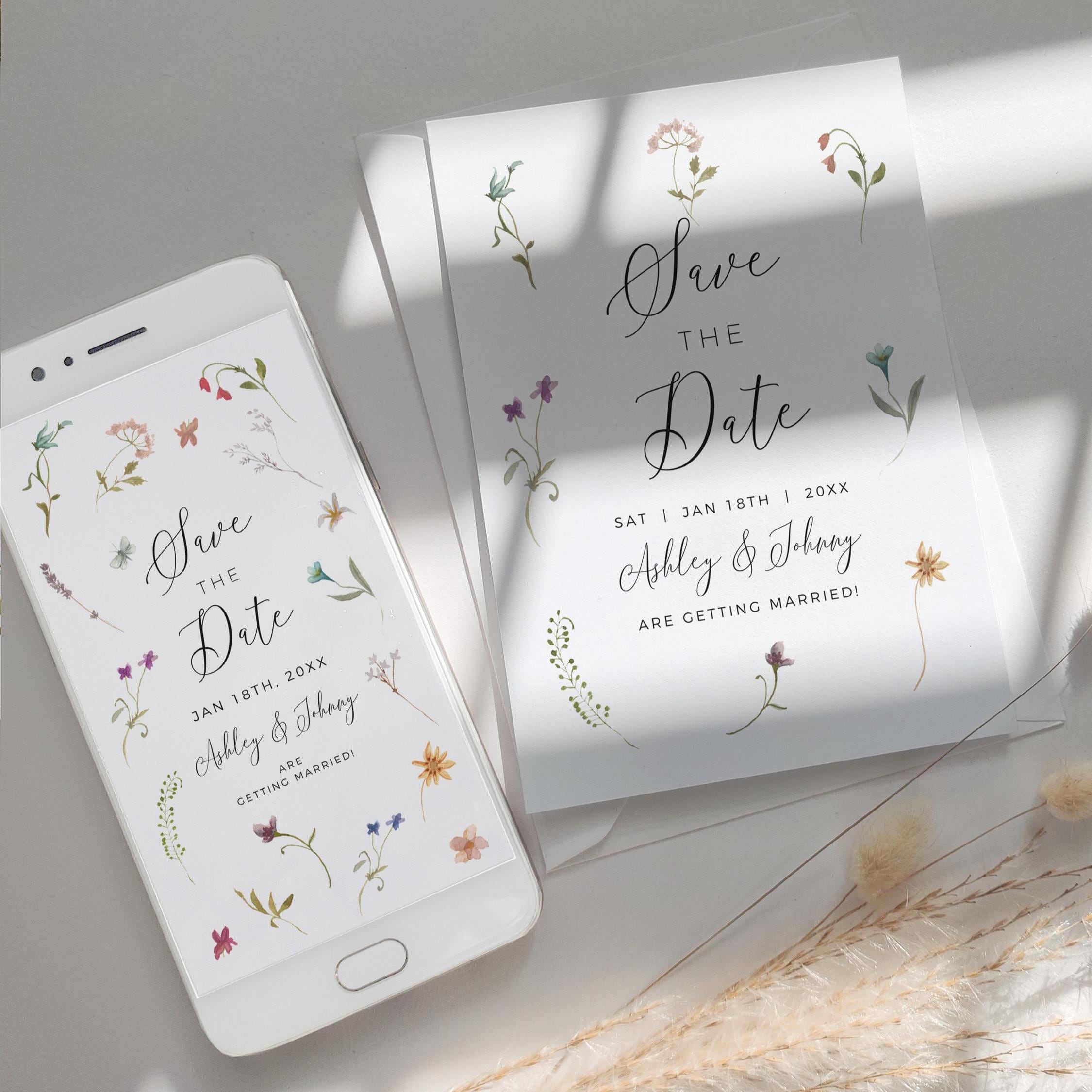 Templates for electronic (phone) and printable Save the Dates with a pretty watercolour wildflower design. Cards in 4 sizes plus a template for the electronic/phone version (great for overseas or last minute guests).
