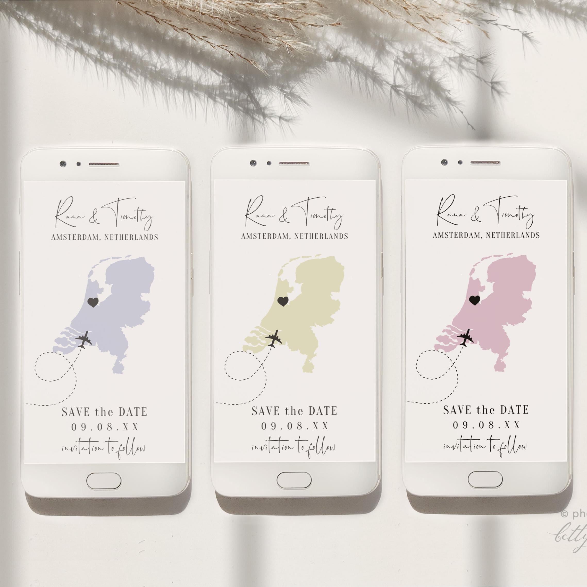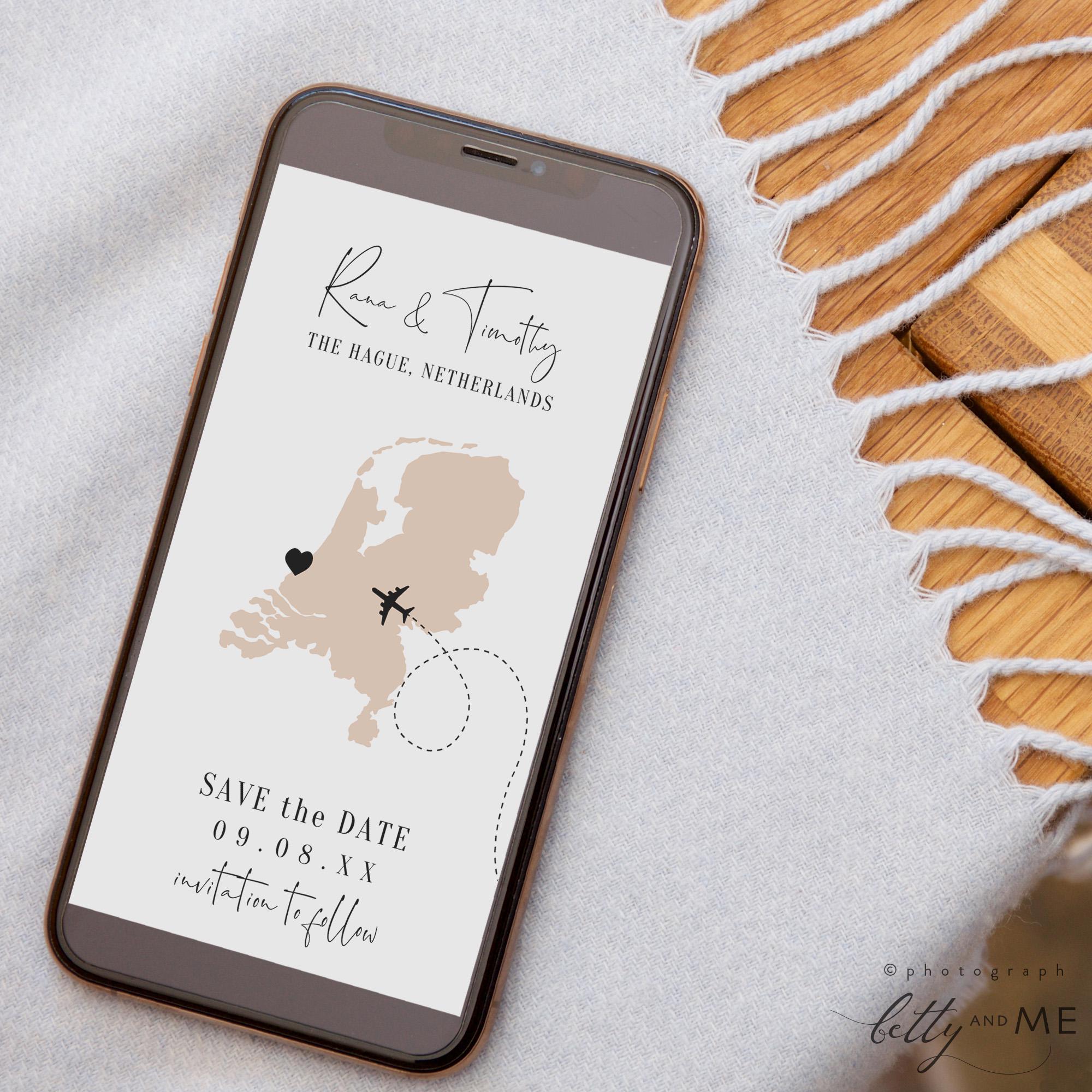 Digital Electronic Save the Dates for your Destination Wedding anywhere in the Netherlands. Easily re-position the heart on the map.