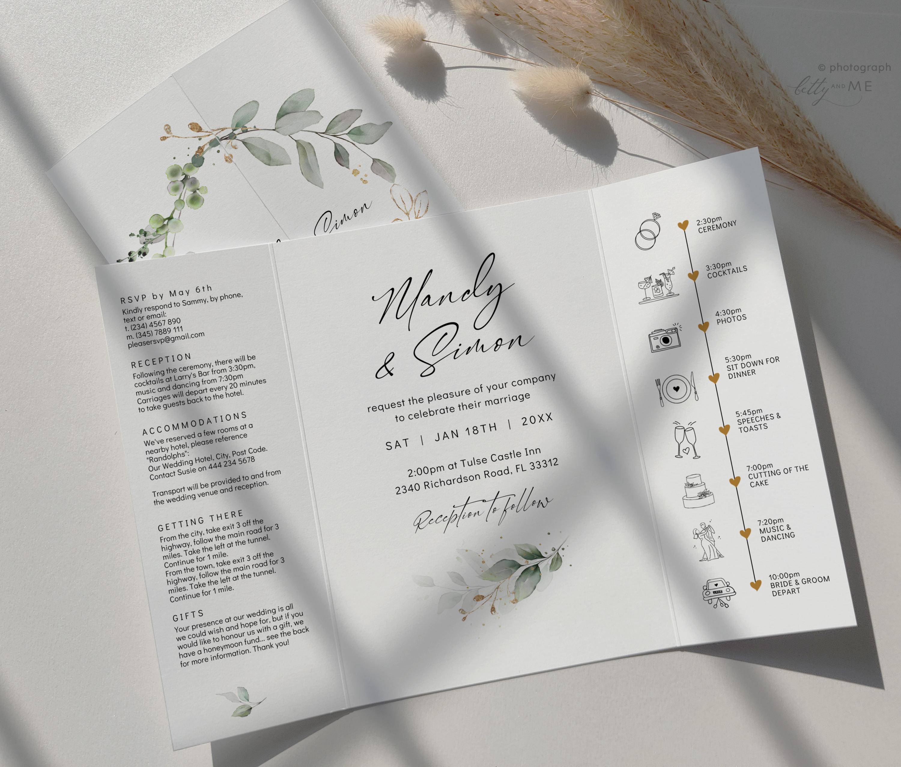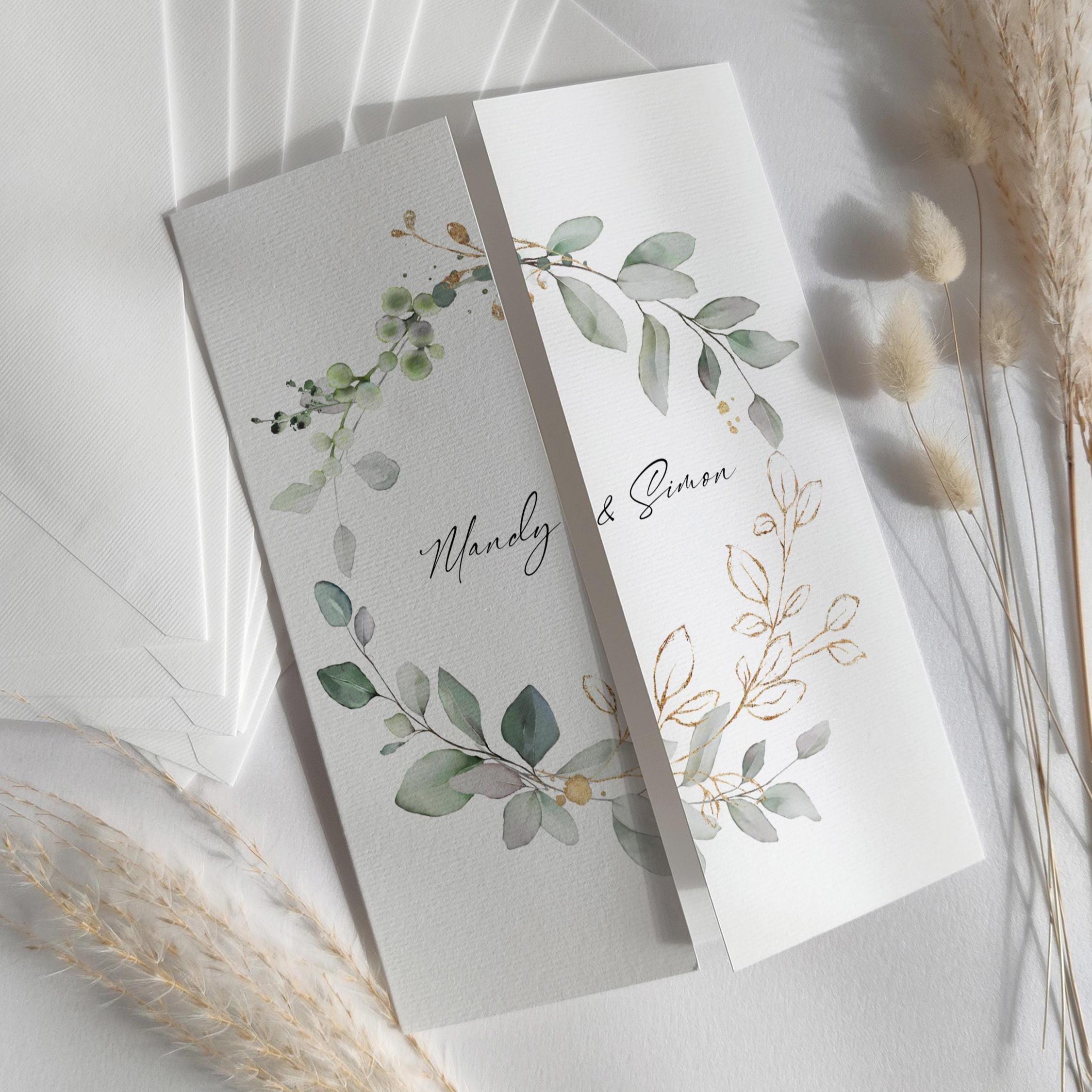 Create your own beautiful greenery gatefold wedding invitations with these Canva templates