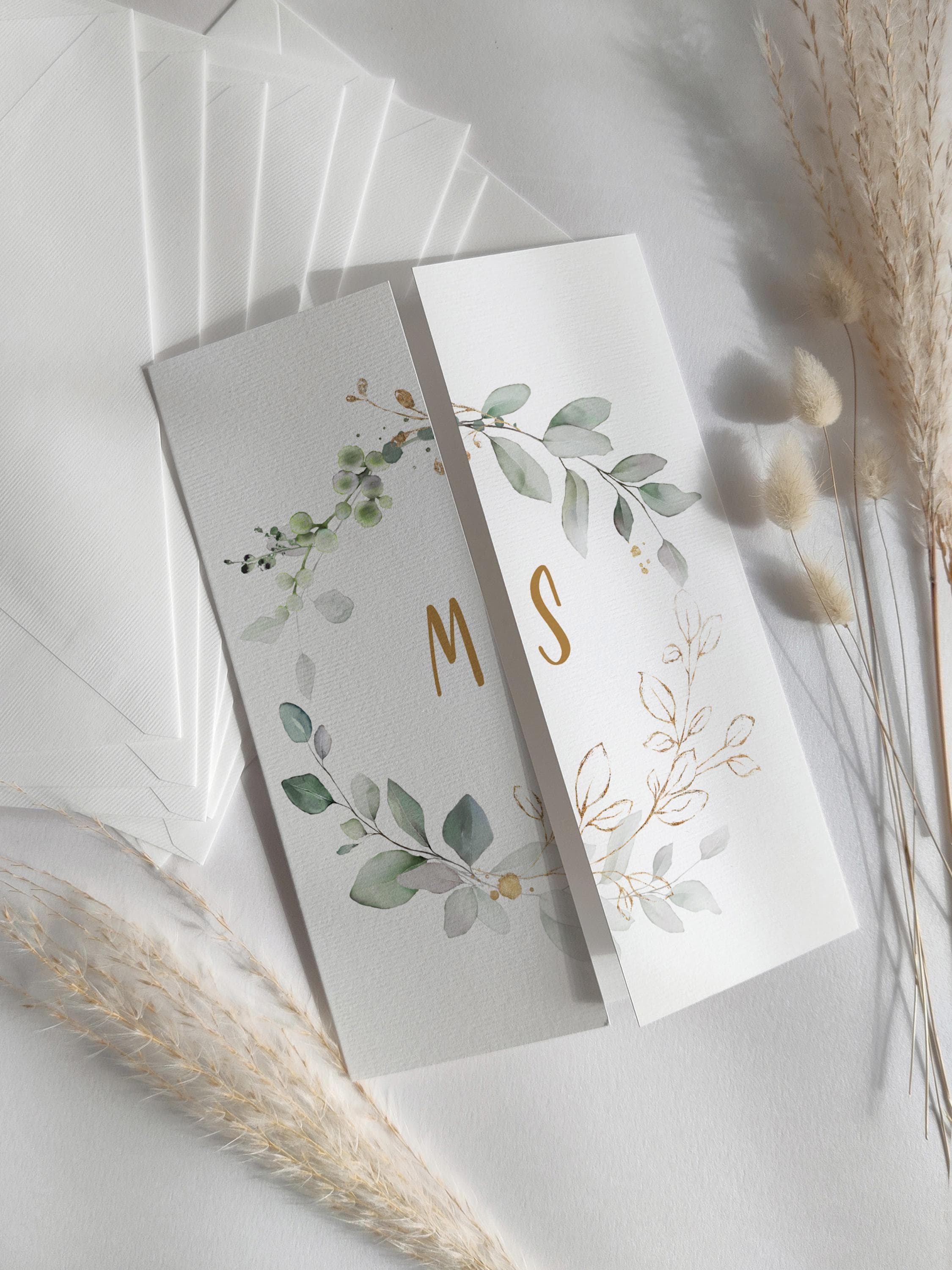 Create your own beautiful greenery gatefold wedding invitations with initials on the front panels. Canva templates: