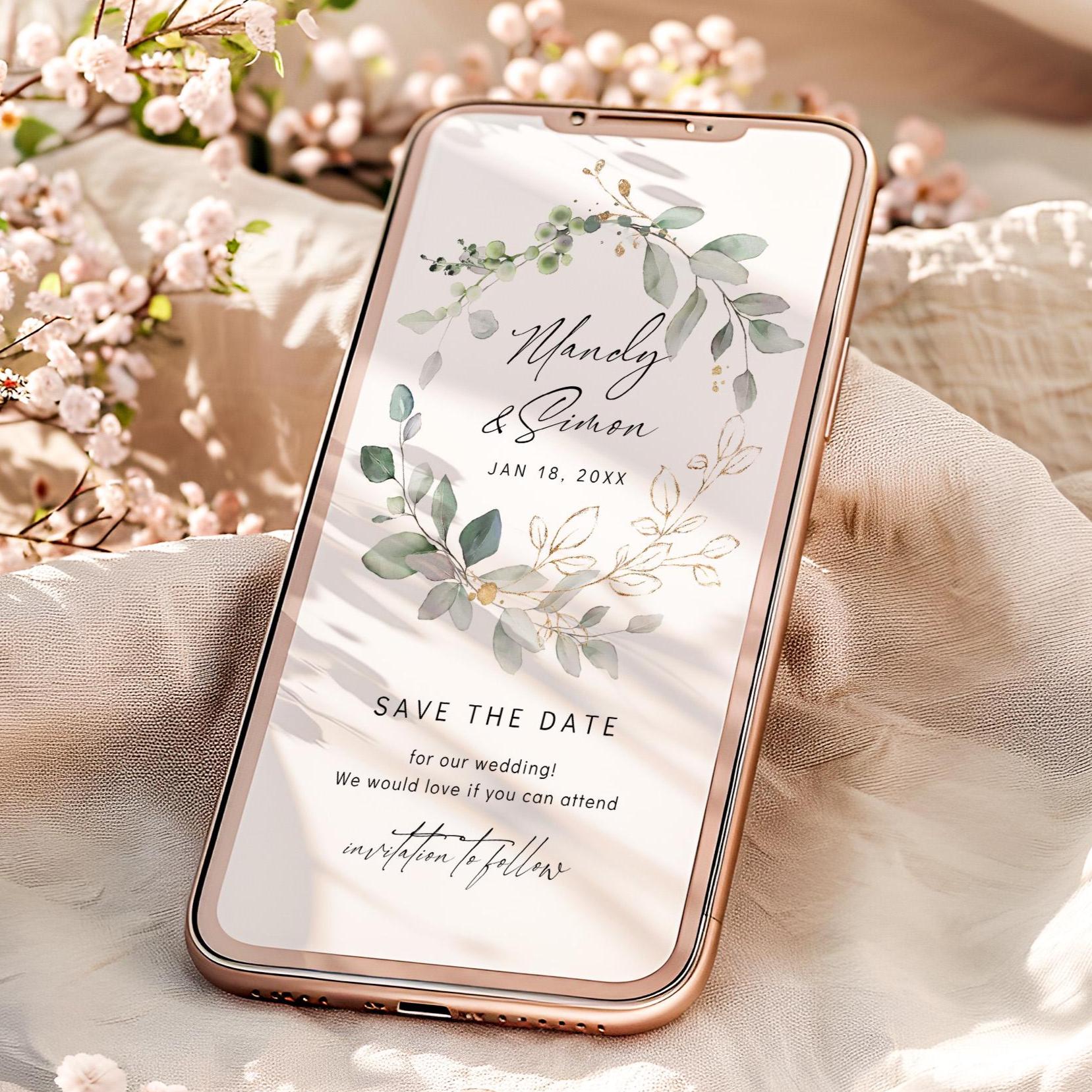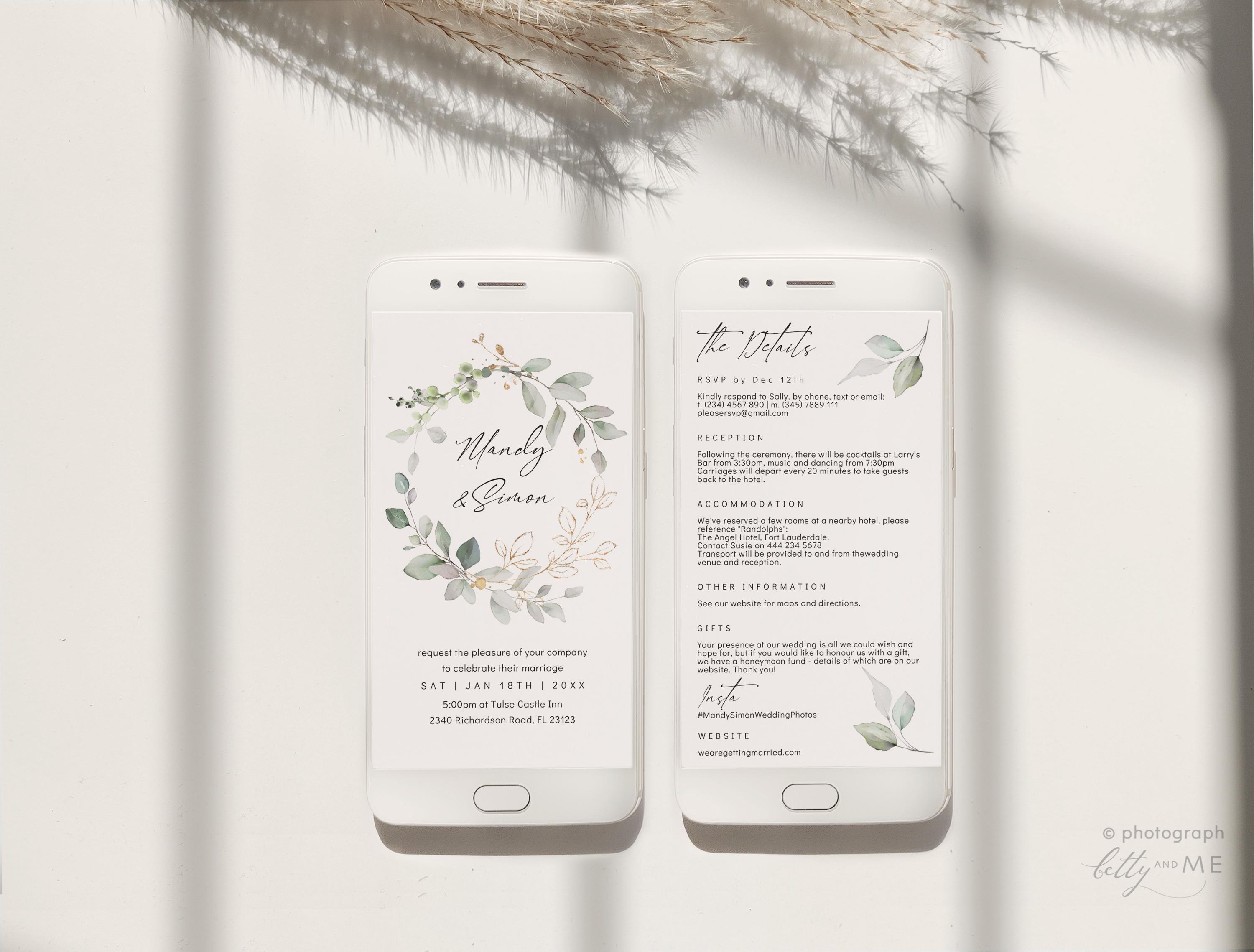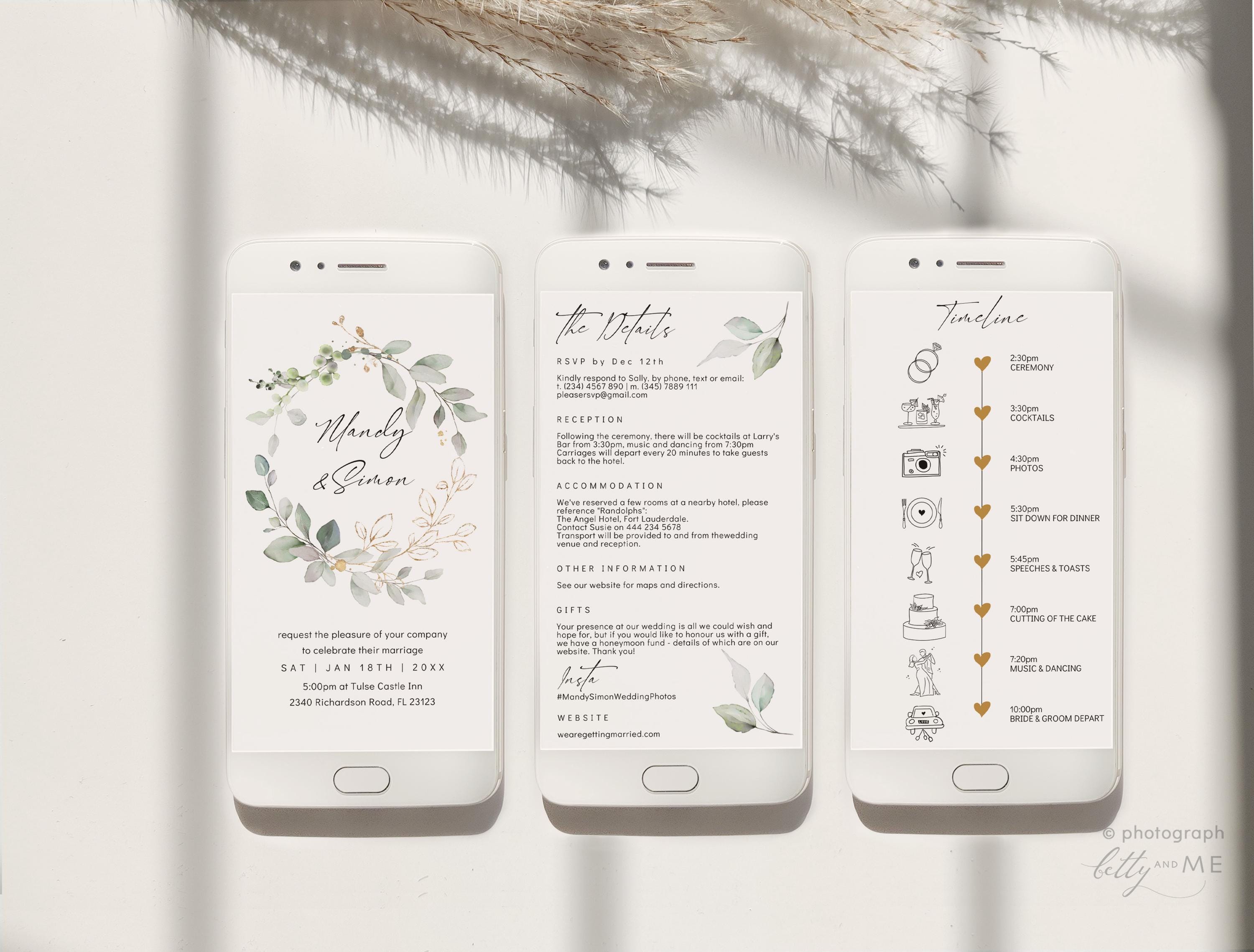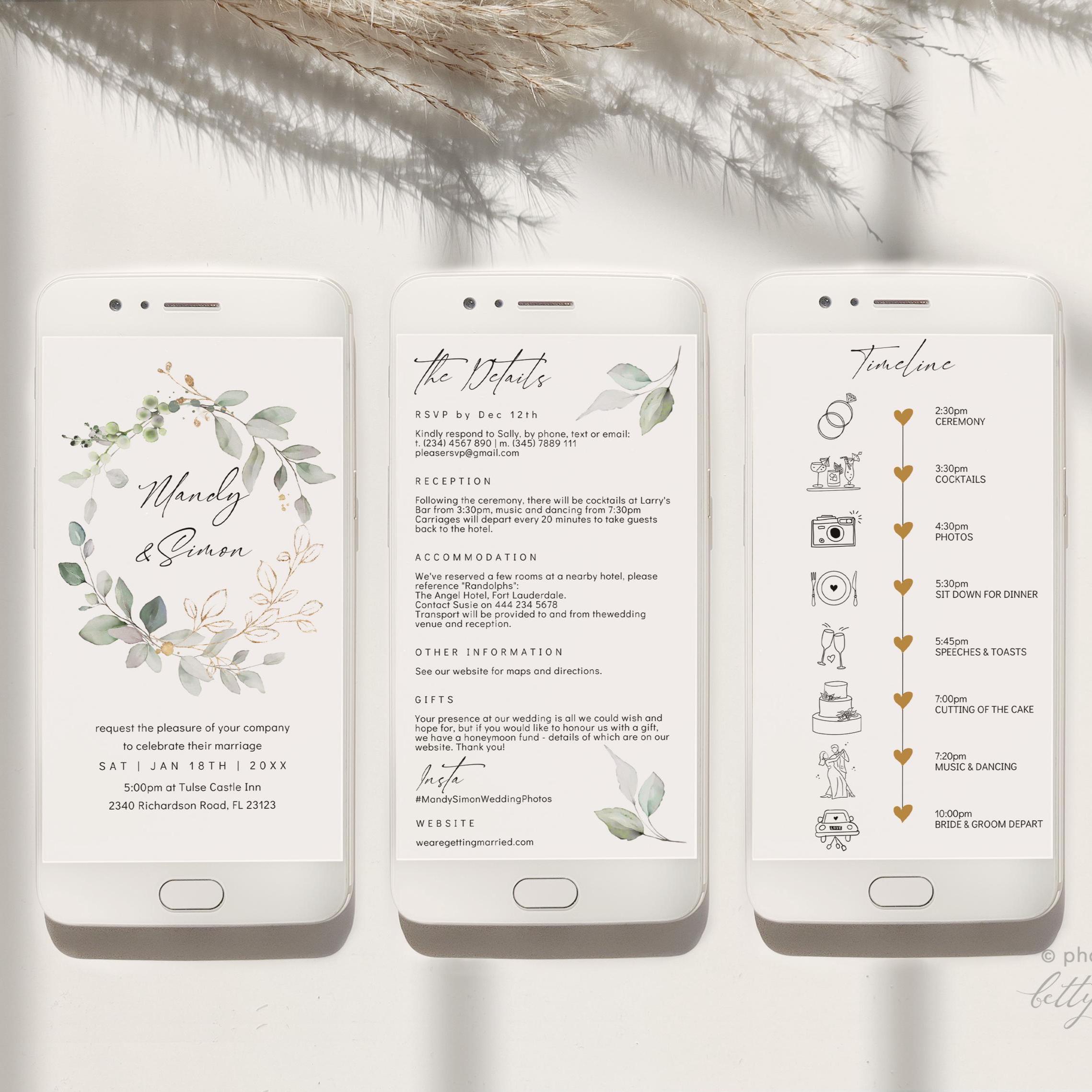 Greenery Wedding Smartphone Invitation set. Choose from Save the Date, Invitation, Details and Timeline templates. Edit and download to Email or Text. Download as PNG or JPG.