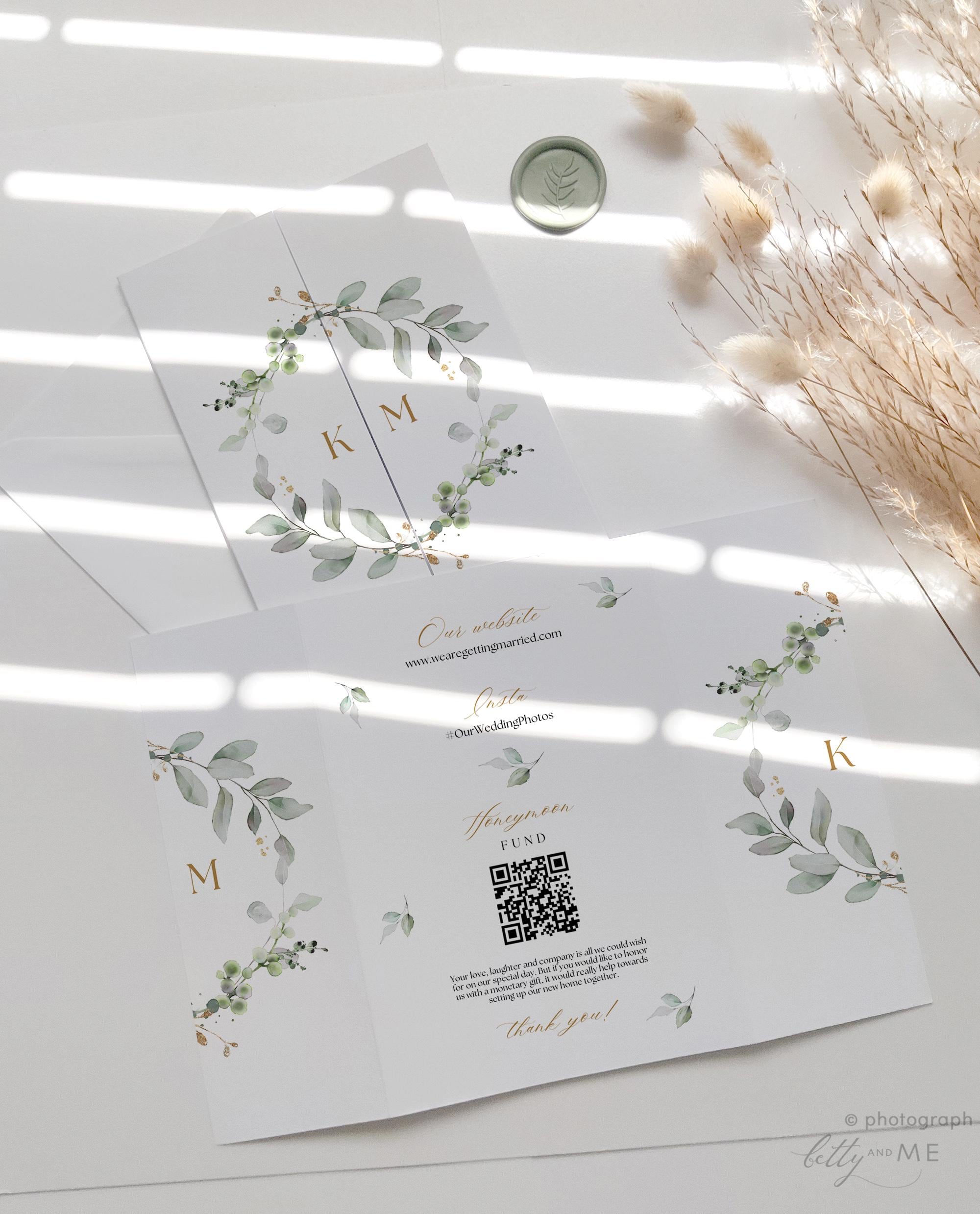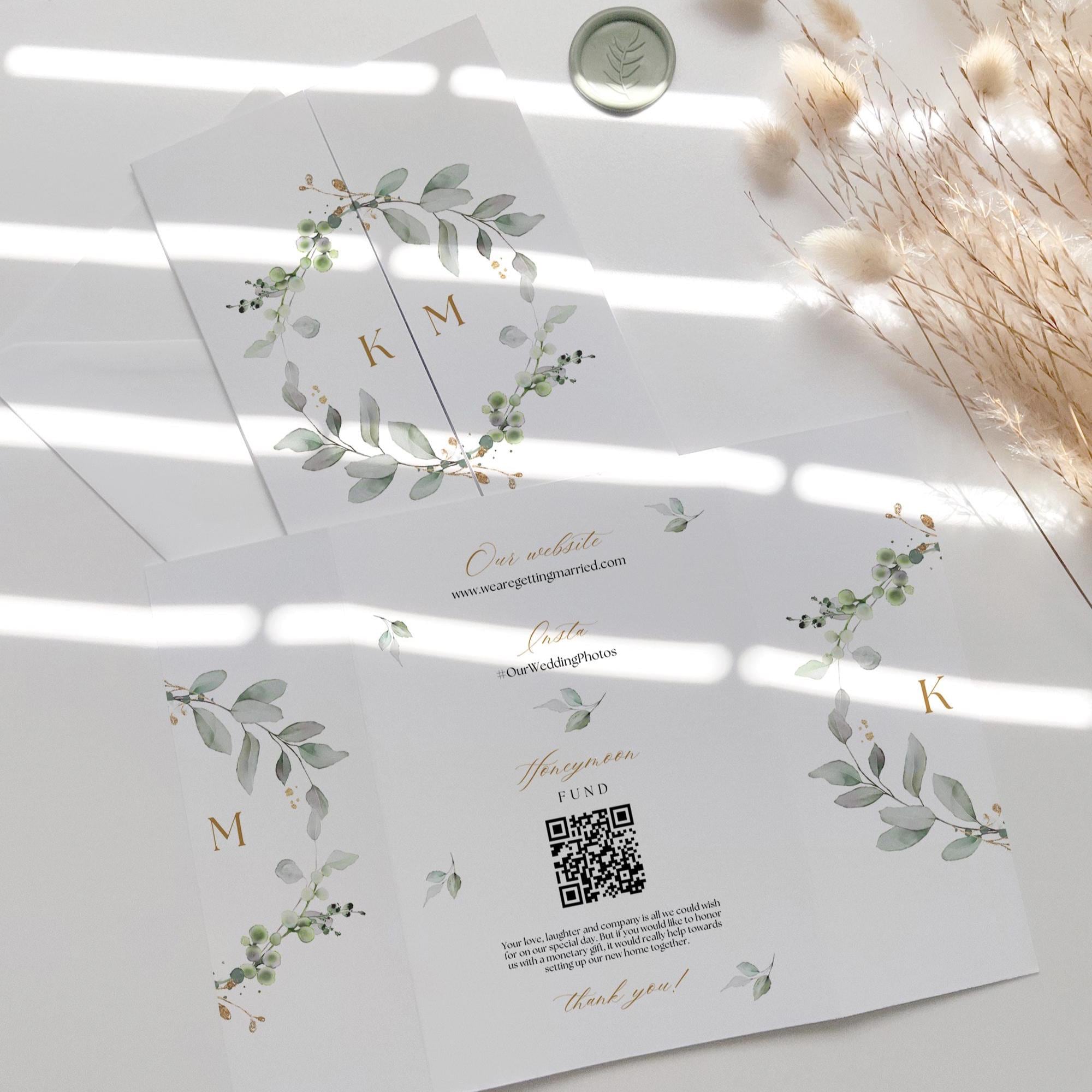 Create your own beautiful greenery gatefold wedding invitations with these Canva templates