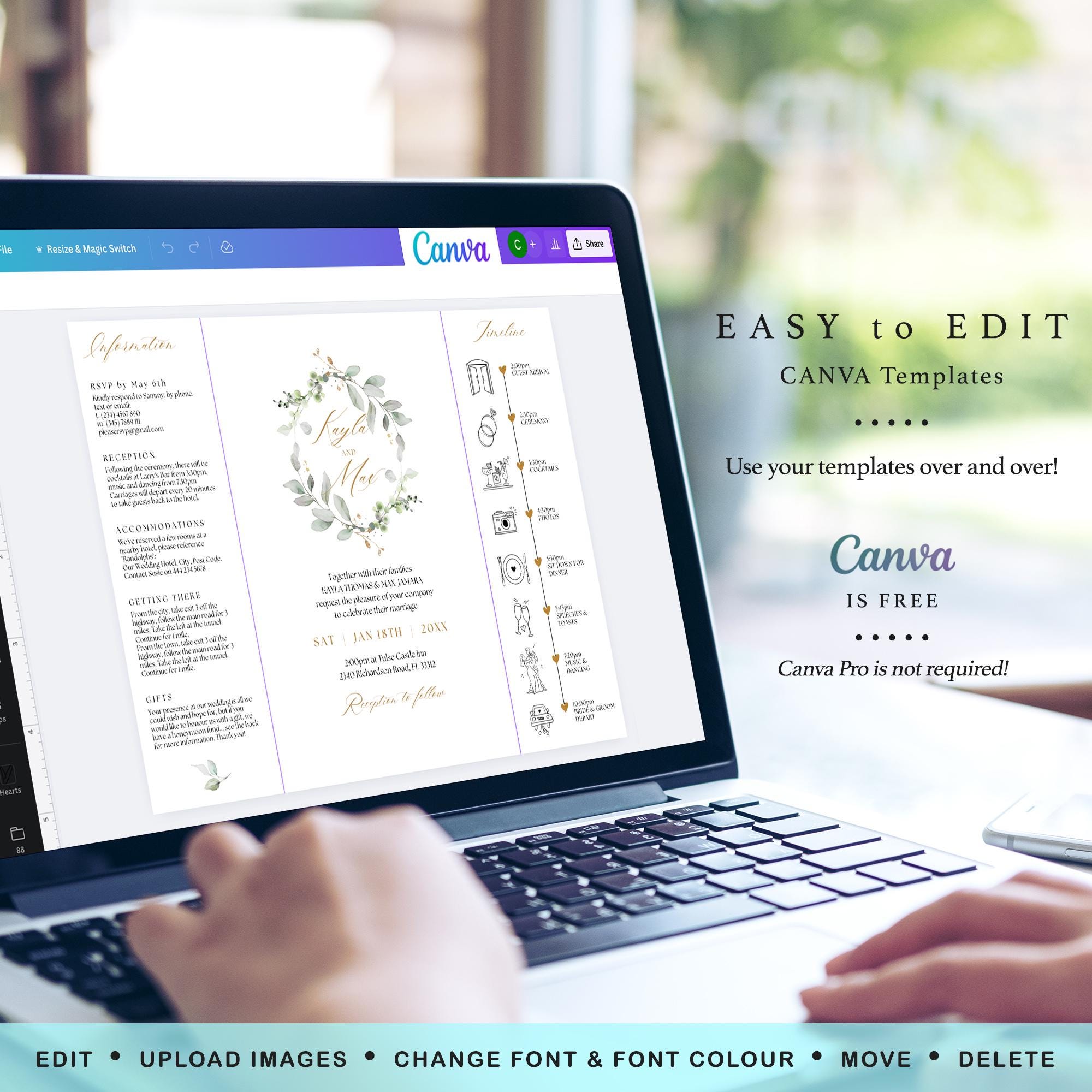 Gatefold Wedding Invitations with a Wreath Design, Timeline and Information, Canva Template | 80G